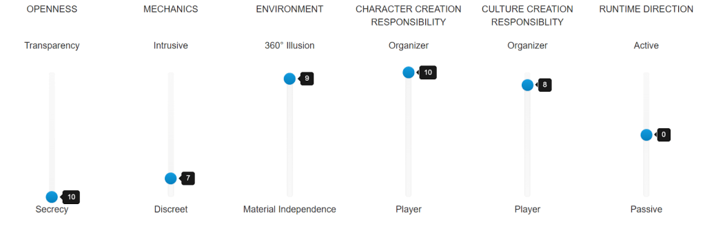 The mixing desk of larp is a useful tool that allows organisers to show their intentions in game designs using a variety of ‘sliders’, as below. We intend for this game to be non-transparent, with discreet mechanics and metatechniques, aiming for a fully immersive WYSIWYG environment.